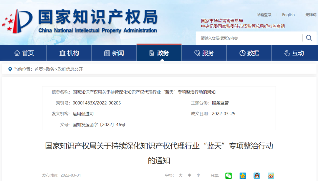 為深入貫徹《知識(shí)產(chǎn)權(quán)強(qiáng)國(guó)建設(shè)綱要(2021—2035年)》《“十四五”國(guó)家知識(shí)產(chǎn)權(quán)保護(hù)和運(yùn)用規(guī)劃》相關(guān)決策部署,落實(shí)2022年全國(guó)知識(shí)產(chǎn)權(quán)局局長(zhǎng)會(huì)議精神,持續(xù)保持嚴(yán)厲打擊知識(shí)產(chǎn)權(quán)違法違規(guī)代理行為的高壓勢(shì)態(tài),確保專項(xiàng)整治勁頭不松、措施不軟、勢(shì)頭不減,有效維護(hù)行業(yè)秩序,有力促進(jìn)知識(shí)產(chǎn)權(quán)服務(wù)業(yè)健康發(fā)展,現(xiàn)就2022年持續(xù)深化知識(shí)產(chǎn)權(quán)代理行業(yè)“藍(lán)天”專項(xiàng)整治行動(dòng)的有關(guān)事項(xiàng)通知如下: