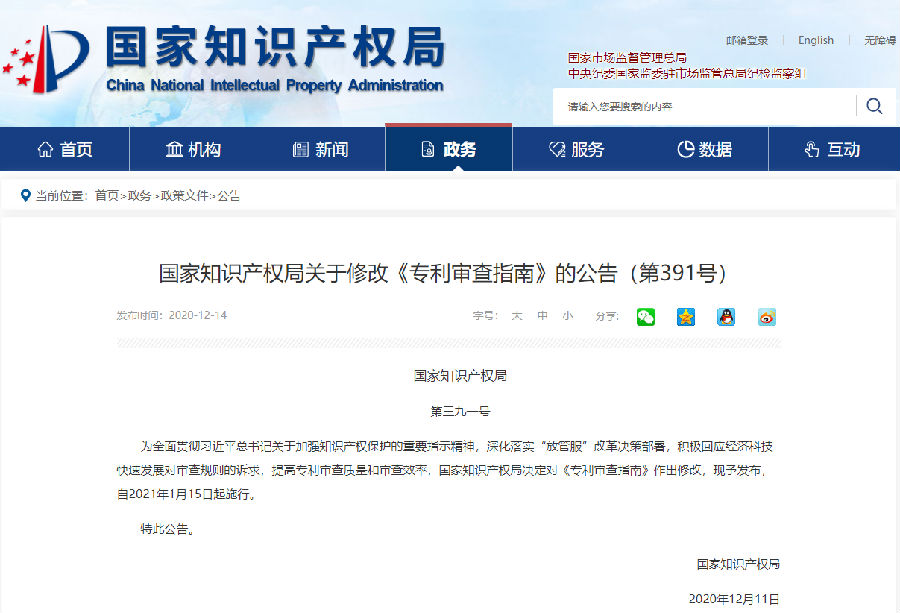 《專利審查指南》最新修改發(fā)布,自2021年1月15日起施行!