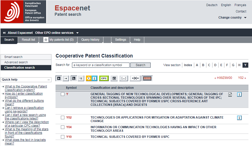 進入EPO的專利數(shù)據(jù)庫Espacenet使用分類號檢索,點擊“Y”部就可找到“Y02”、“Y04S”。