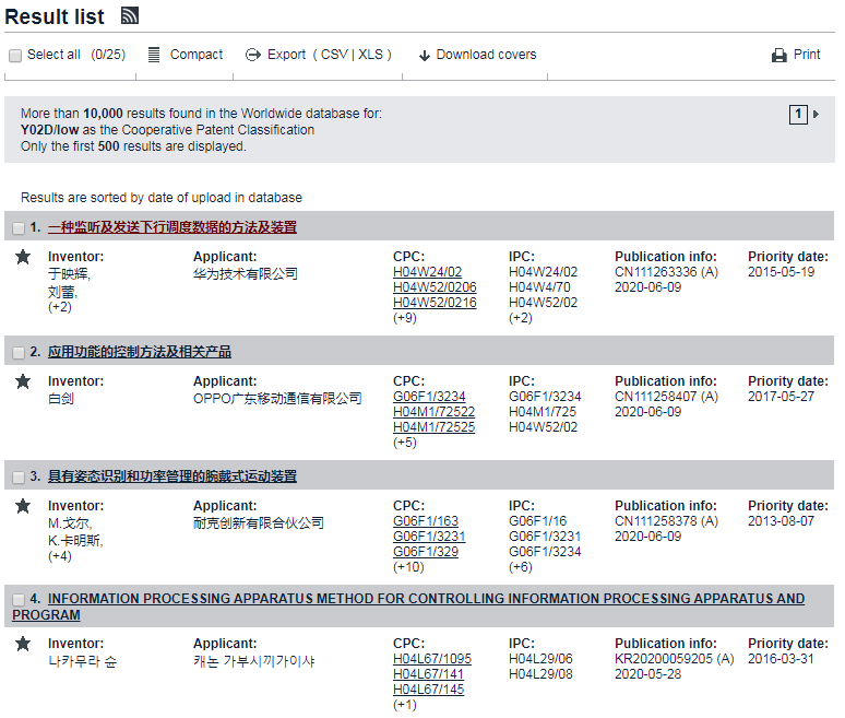 檢索到的第一項專利是“一種監(jiān)聽及發(fā)送下行調(diào)度數(shù)據(jù)的方法及裝置”(CN20201071996),根據(jù)專利摘要,該裝置可以節(jié)省耗電量。而該專利的IPC主分類屬于H04W,從上圖也可以看到,檢索到的第二項屬于G06F、第四項屬于H04L。正是由于綠色專利分散在IPC的眾多技術(shù)領(lǐng)域,而通過“Y02”、“Y04S”能夠?qū)⑦@些跨技術(shù)領(lǐng)域的專利標(biāo)記出來,因此綠色專利分類有助于人們識別和獲取綠色專利信息。