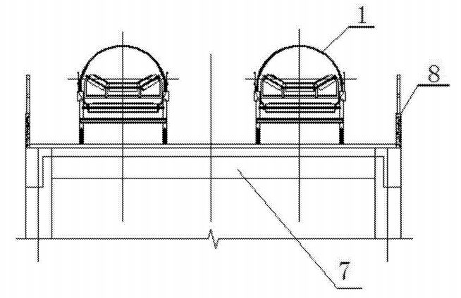 1、一種棧橋防雨排水系統(tǒng),其特征在于,包括:棧橋3以及設置于所述棧橋3上的輸送機2,所述棧橋3在所述輸送機2兩側均設置有隔離墻33,所述棧橋3包括所述隔離墻33之間的污水區(qū)31,以及所述隔離墻33外側的雨水區(qū)32;還包括防護罩1,所述防護罩1包括罩體11、第一擋板121及第二擋板122,所述罩體11固定于所述輸送機2,所述第一擋板121及所述第二擋板122樞接于所述罩體11兩側壁、并且分別位于所述輸送機2兩側,所述第一擋板121的自由端與所述第二擋板122的自由端之間的距離不小于所述隔離墻33靠近污水區(qū)31的兩側壁之間的距離;所述第一擋板121的自由端、所述第二擋板122的自由端均抵持于所述隔離墻33頂部;所述第一擋板121和所述第二擋板122的樞接端均向所述罩體11內部延伸、并與所述罩體11部密封配合。